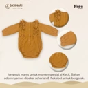 Sasinari memilih bahan terbaik seperti cotton foam yang cukup adem untuk dipakai seharian, cukup fleksibel untuk gerakan bayi, dan manis untuk momen istimewa bersama keluarga.